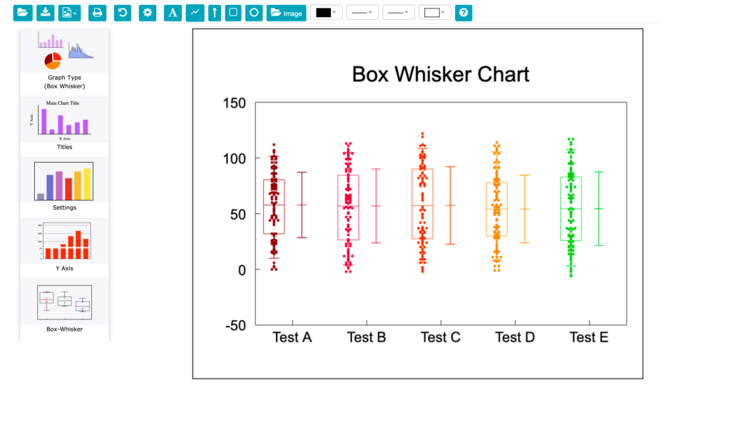 Note: The Titles sidebar icon allows you to add titles to the chart. The Settings sidebar icon allows you to set the marker style (color, size, and type) for the sample data for each graph series, and line color and thickness for displaying whisker boxes, mean, median, and connecting lines. Legend text to label the X Axis is also entered in the Settings menu. There is also a Y-axis icon which you should use to control the scaling.