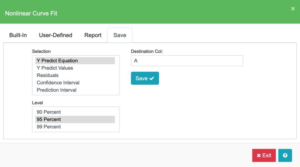 After completing the Sigmoidal fit calculation in Nonlinear Curve Fitter, click on the Save tab. Select “Y Predict Equation” and enter “A” in the Destination Col field. The Sigmoidal equation will be saved in the Equation entry for Graph A.