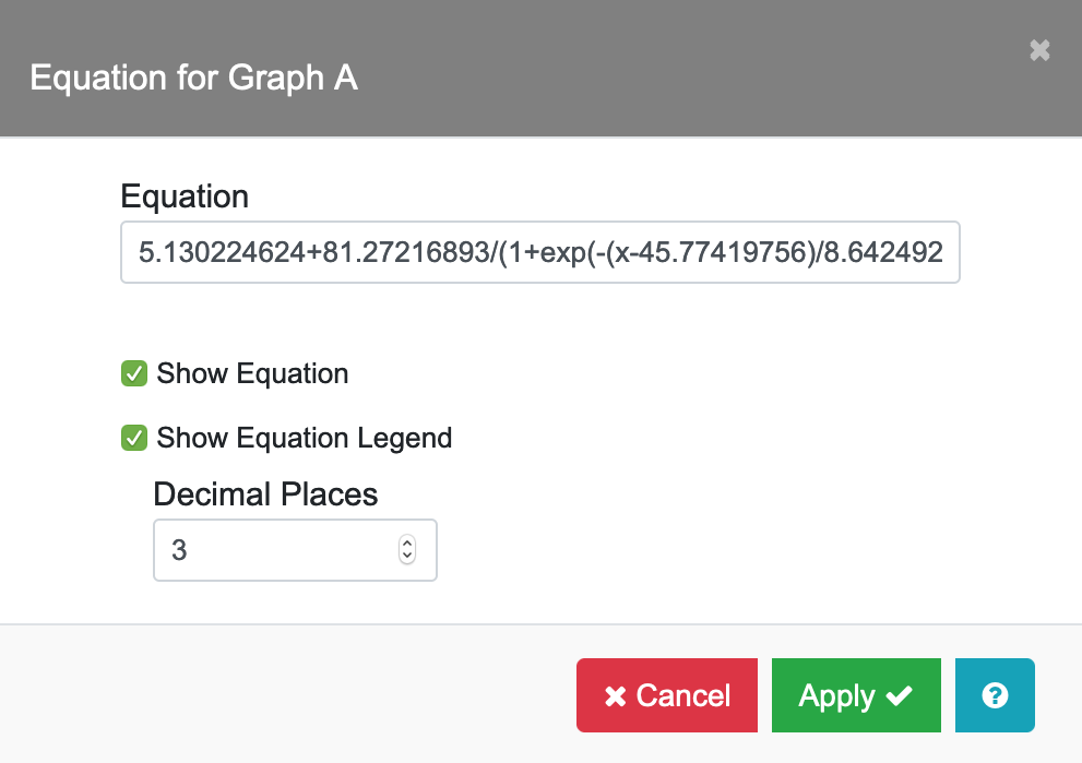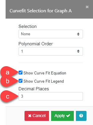 You can optionally choose to limit the number of decimal places displayed. High-precision numbers are used in the curve fit calculation, and this yields an equation with a large number of decimal places. When you enter a value in the Decimal Places field (c), the equation is displayed in a more simplified form.