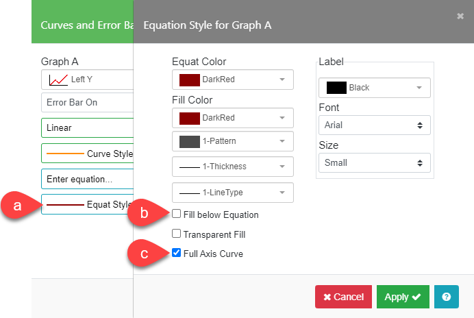 The Equation Style (a) options define the color and line style for the equation chosen. The Fill below Equation (b) box, when checked, will fill the area below the equation with the color and pattern chosen for the Equation line. Full Axis Curve (c) can be used to define the extent of the equation. By default, the equation is plotted across the entire graph extending beyond the data. If you don’t want to extrapolate the equation beyond the data, disable this option. The equation will only be drawn from the first X data point to the last X data point. The Label section will allow you to choose the font, size, and color for the equation.