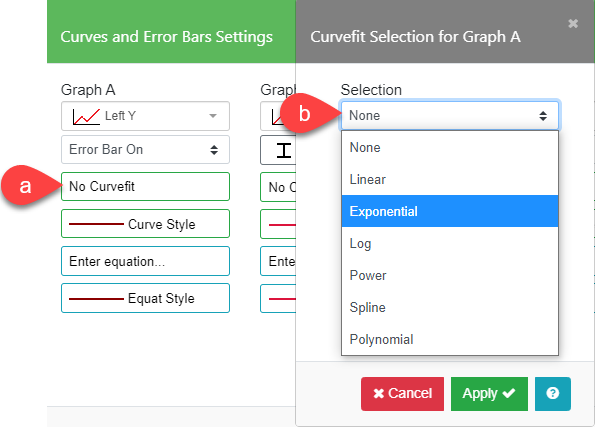 This option allows you to automatically display the Curve Fit equation and legend on your graph. Simply check the Show Curve Fit Equation box (a) and the Show Curve Fit Legend box (b).