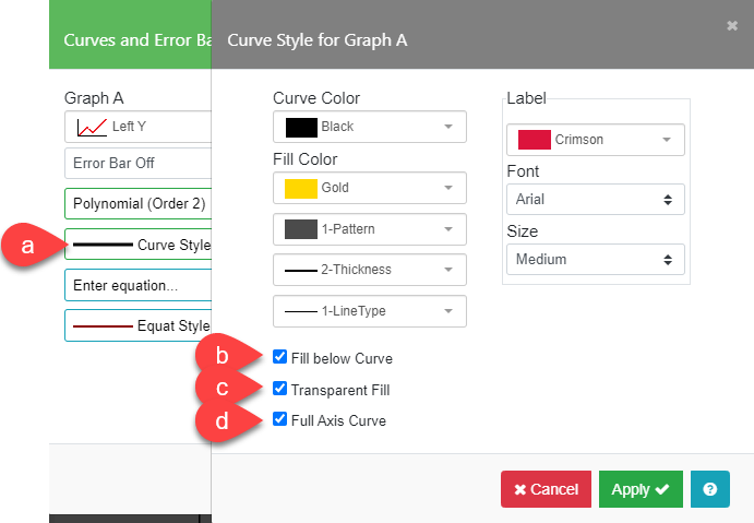 The Curve Style options (a) define the color and line style for the curve fit chosen. The Fill below Curve box (b) when checked will fill the area below the curve with the color and pattern chosen for the curve fit line. Full Axis Curve (d) can be used to define the extent of the curve fit. By default, the curve fit is plotted across the entire graph extending beyond the data. If you don’t want to extrapolate the curve beyond the data, disable this option. The curve will only be drawn from the first X data point to the last X data point. The Label section will allow you to choose the font, size, and color for the curve fit equation.
