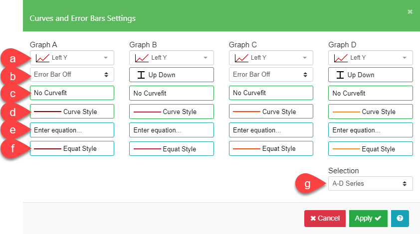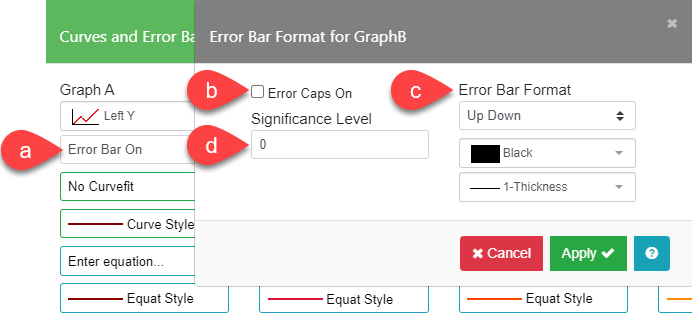 - Select the Curves and Error Bars sidebar button. Check Error Bar On for Graph A and set the Error Bar Format to “Up Down” for Graph B. Next, check Error Bar On for Graph C and set Error Bar Format to and “Left Right” for Graph D.