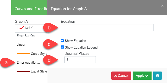 Click the Enter Equation field (a) to bring up a submenu to enter a user-defined equation of the form y = f(x). For more information see section on Entering Equations.