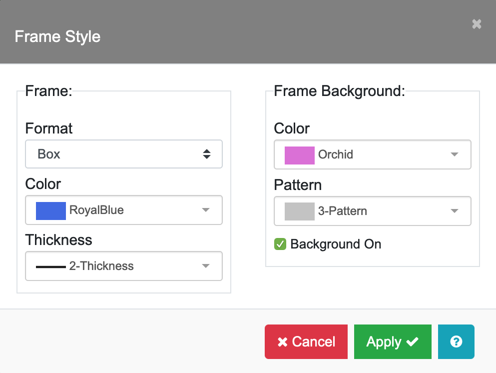 Click on the Frame Style/Background (a) field to open the Frame Style submenu which has similar features to other Frame Style menus. In the case of Polar Plots, the Frame is the angular major divisions. When you choose the Color and line Thickness for the frame, all the concentric divisions will be the same style as shown in the plot below in RoyalBlue. The Frame Background is the inside area of the plot as shown in plot below in Orchid.