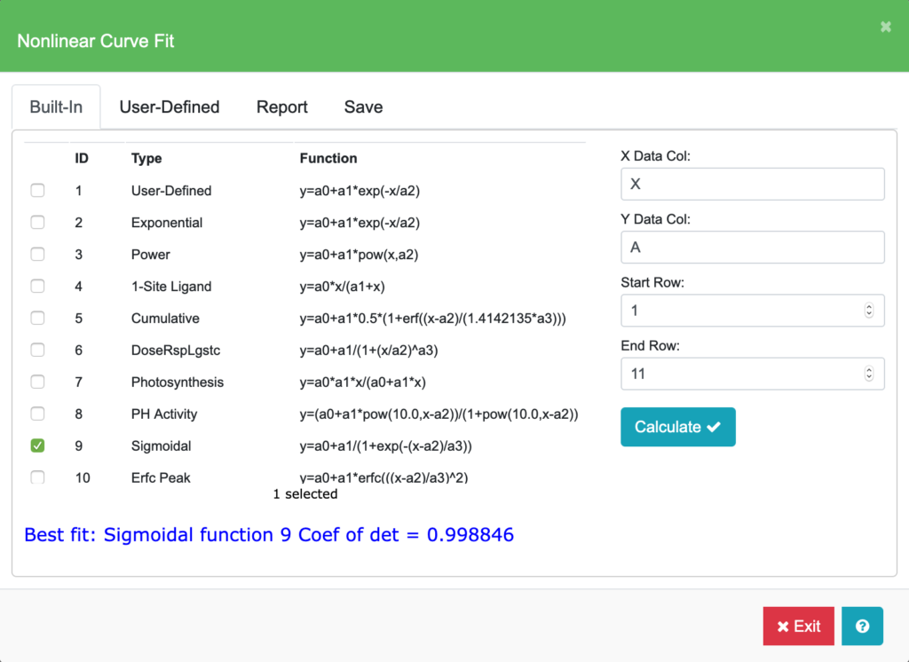 - Click the Curve Fitter button and select Nonlinear Curve Fit from the dropdown list. The Nonlinear Curve Fit menu will appear. Let’s assume that we know our data has a trend like a sigmoidal curve. Select the Sigmoidal (#9) box and then enter “X” in the X Data Col field, “A” in the Y Data Col field, “1” in Start Row, and “11” in End Row.